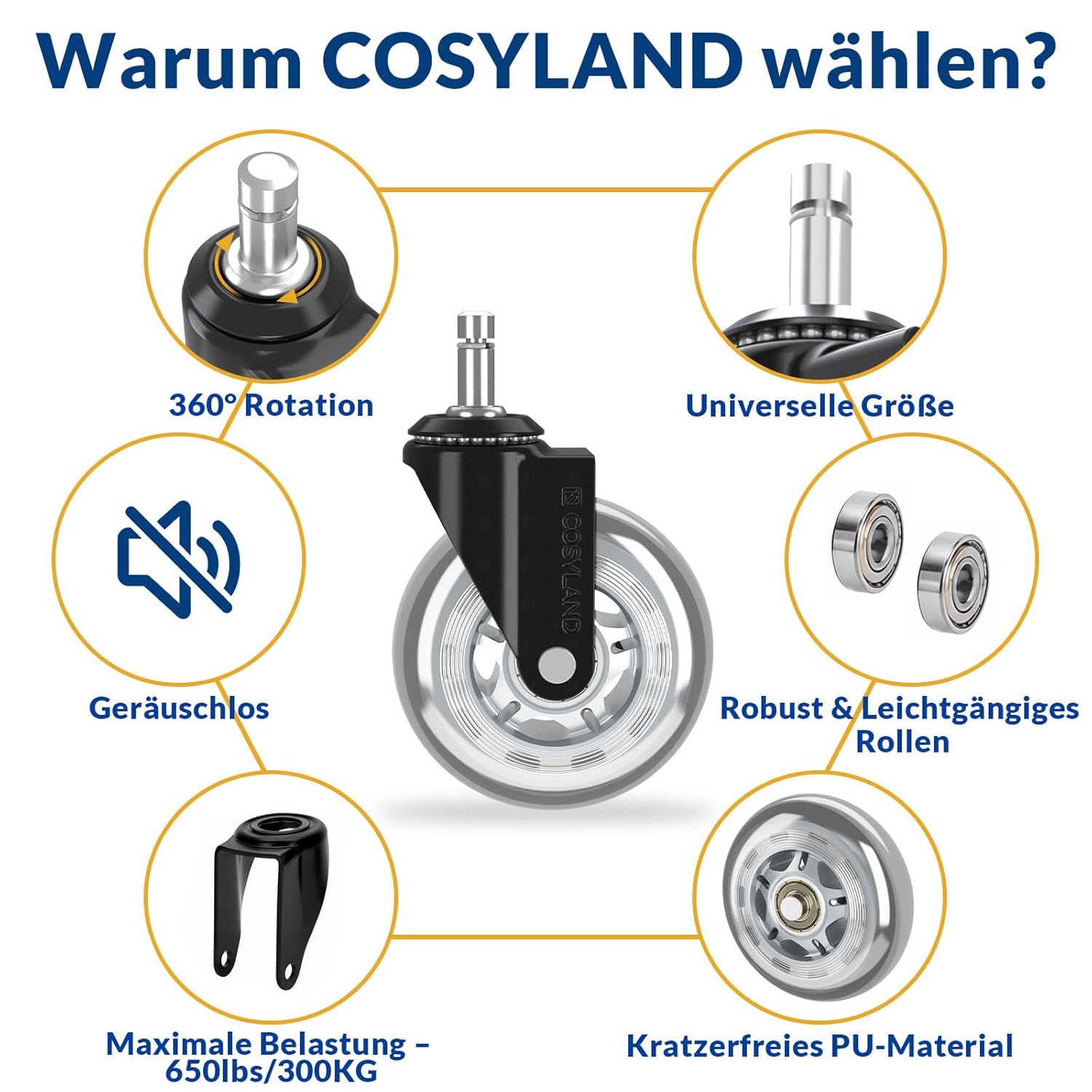Check Compatibility First – COSYLAND casters have a stem size of 7/16" x 7/8" (11 x 22 mm). Please confirm fit; not suitable for most IKEA or certain branded chairs.