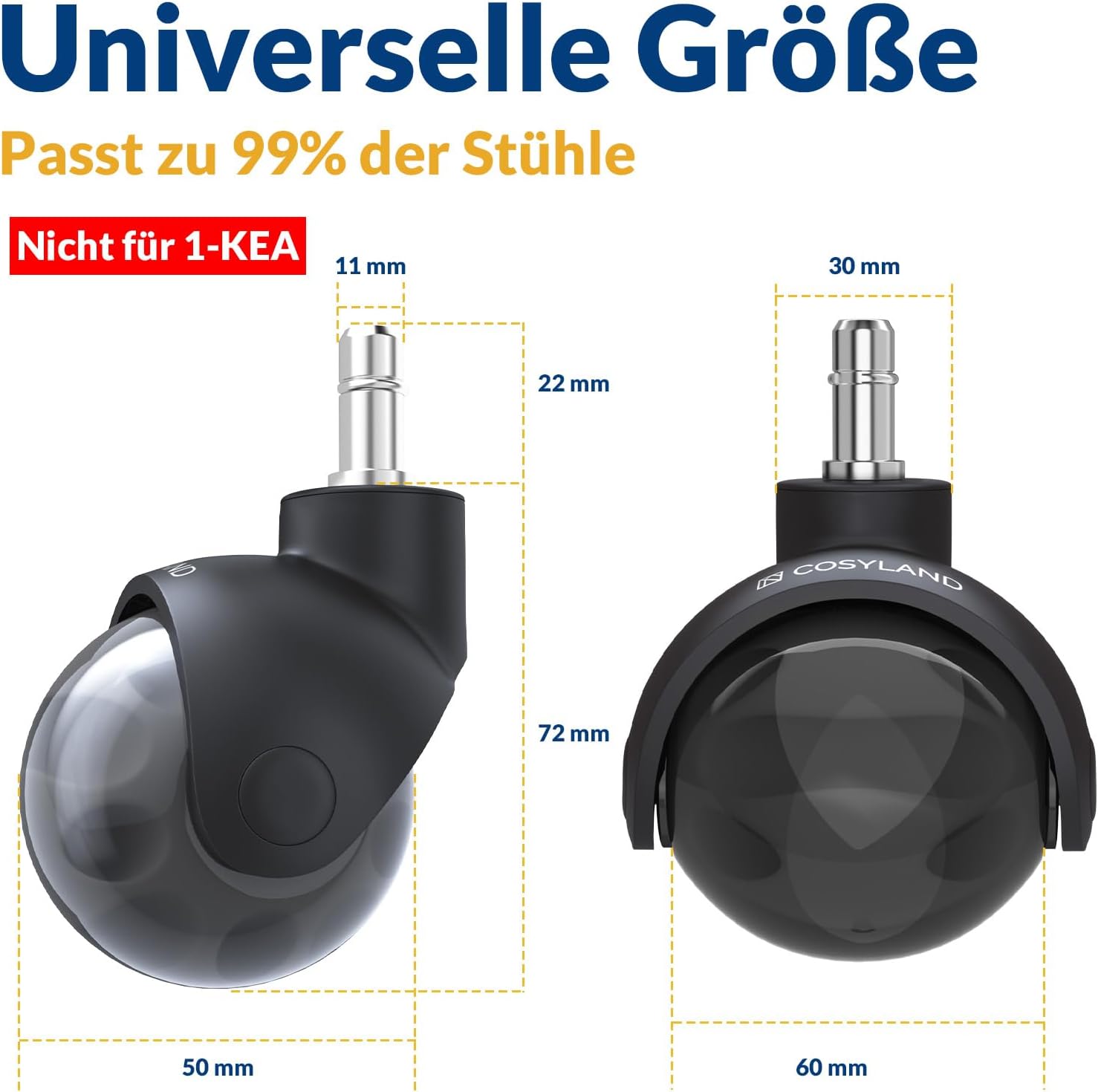 - Replacement casters for almost all office chairs: Your worry-free choice! Our office chair casters fit 99% of office chairs (please check the caster axle size before ordering). Please note: NOT compatible with 1KEA chairs. (Caser axle size: 11 x 22 mm)