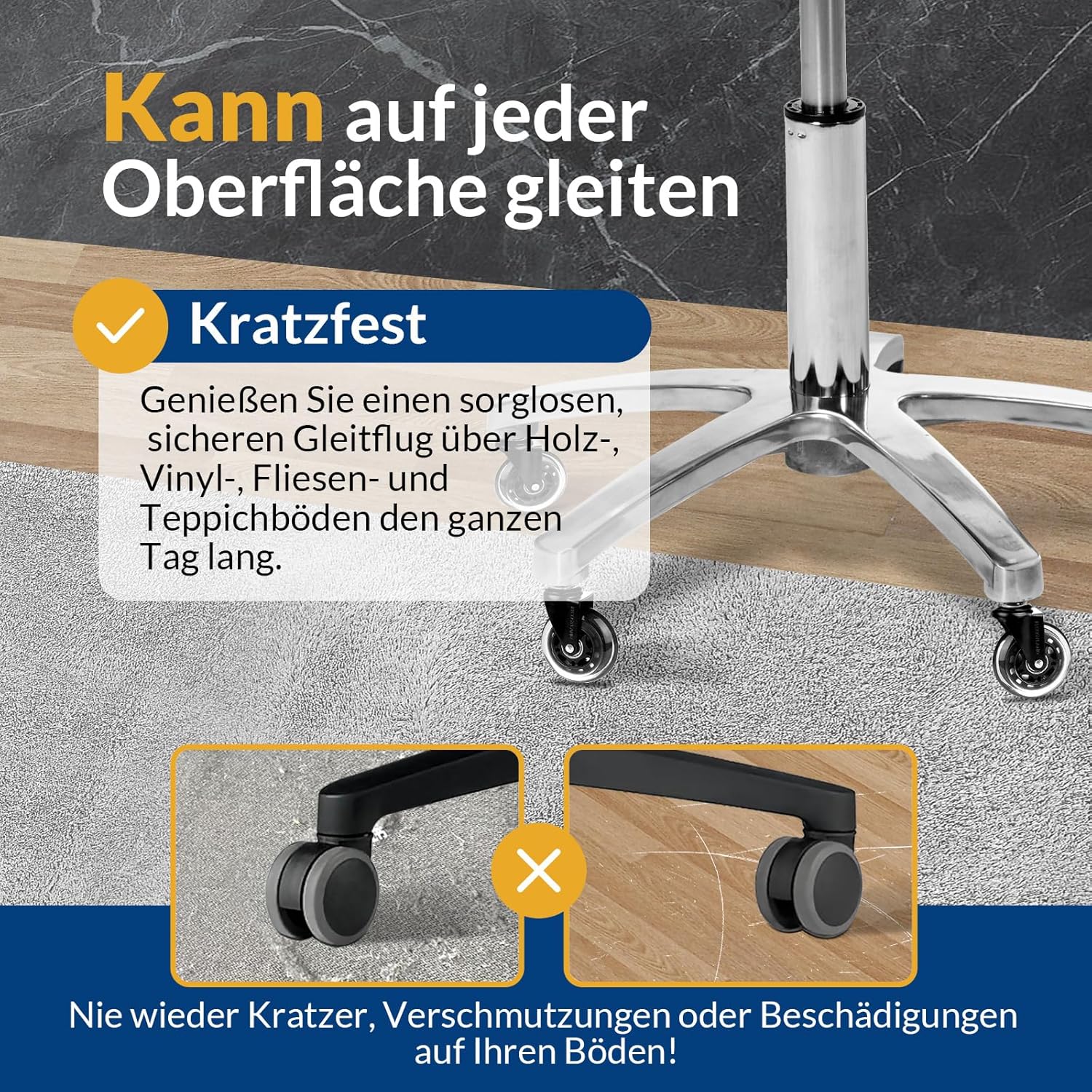 Floor-Friendly & Mat-Free: No need for extra floor mats. The soft polyurethane wheels roll smoothly without leaving scratches or marks on hardwood, vinyl, laminate, or tile floors.