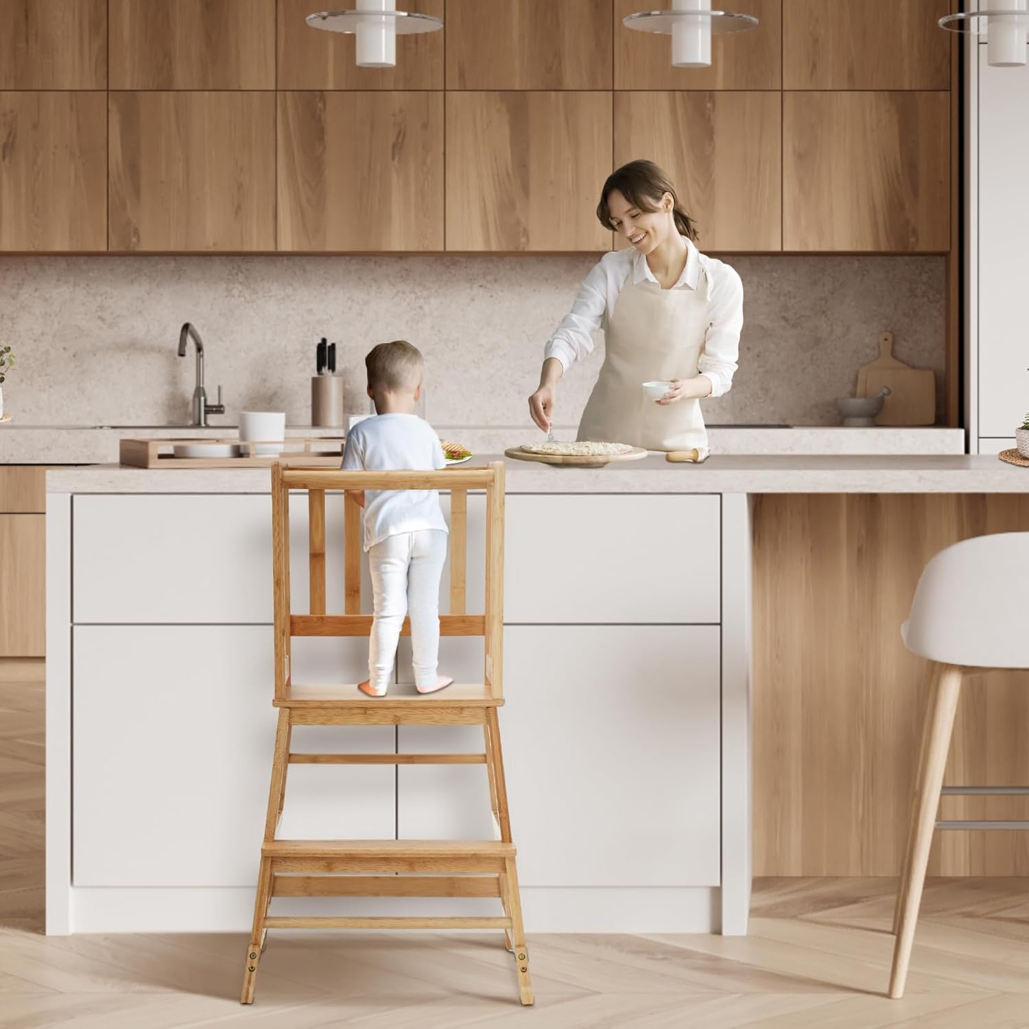 Durable:This sturdy learning tower stool is made from solid natural bamboo and features a child-safe, non-toxic surface that prevents scratches and scuffs. It safely supports toddlers aged 18 months to 3 years, with a maximum weight capacity of 68 kg (150 lbs).
